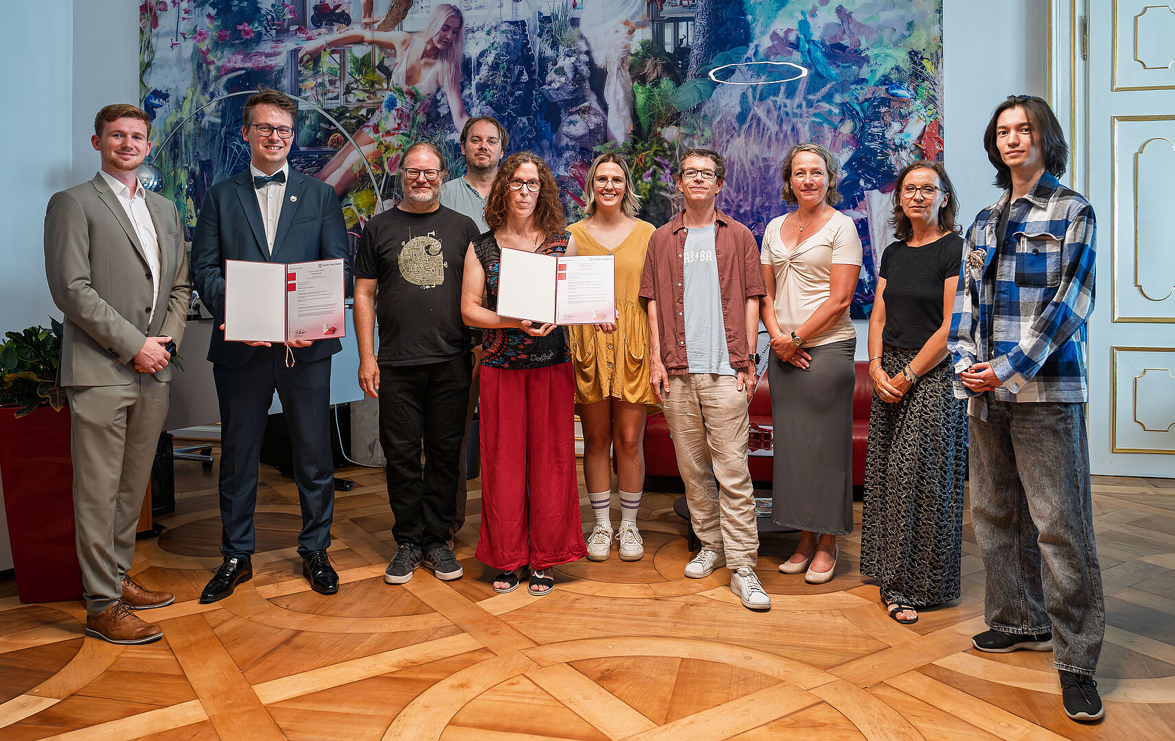 Gruppenbild mit den Gewinner*innen (v.l. Jonas Kubesch, Marco Venditto, Künstler*innengruppe gold extra, Kulturabteilungsleiterin Dagmar Aigner, Martina Greil Fachbereich Film/digitale Medien, Raffael Moser (Jurymitglied)