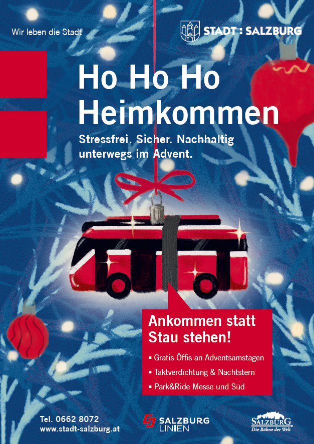 Die Stadt Salzburg und die Salzburg Linien setzen mit der Aktion „Ho Ho Ho Heimkommen“ in der Adventzeit 2025 auf ein klares Paket aus mehr Angebot, Gratis-ÖV und besserer Vernetzung. Verdichtete Taktungen, erweiterte Nachtverbindungen, kostenlose Fahrten an Adventsamstagen und eine stadtweite Informationskampagne machen den öffentlichen Verkehr zum zentralen Baustein einer klimafreundlichen Vorweihnachtszeit. Ziel ist es, Besucher:innen frühzeitig auf Bus und Bahn umzulenken, die Innenstadt zu entlasten und die Vorteile nachhaltiger Mobilität sichtbar zu machen.