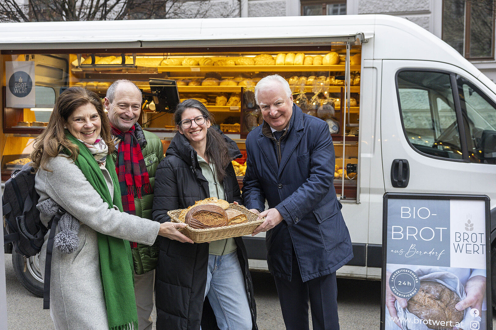 v.l.: Constanze Antosch (Amtsleiterin Markt- und Veterinäramt), Abteilungsvorstand der MA 1 Bernd Huber, Marianna Hock-Rath von der Bäckerei Brotwert und Vizebürgermeister Florian Kreibich