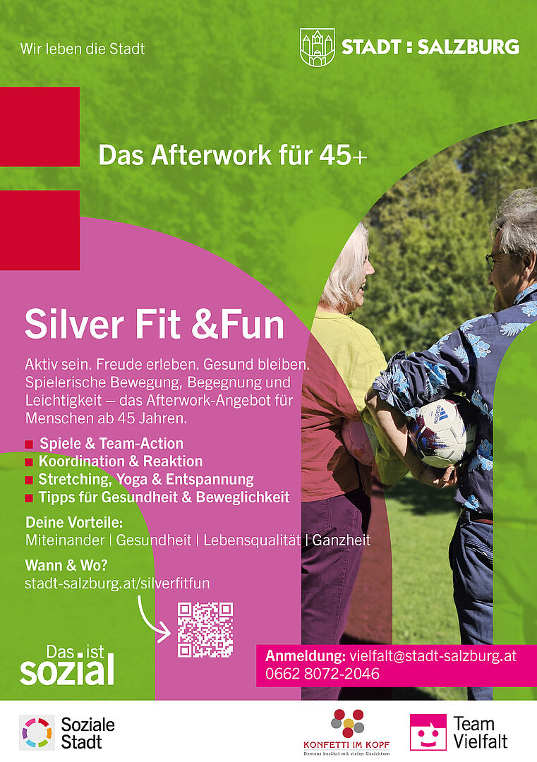 Mit dem neuen Bewegungsprogramm „Silver Fit & Fun“ setzt die Stadt Salzburg einen wichtigen Schritt in der Gesundheitsförderung und Prävention für Menschen ab 45 Jahren. „Gesund älter werden beginnt nicht erst in der Pension. Mit Silver Fit & Fun schaffen wir ein Angebot, das Bewegung, Begegnung und Lebensfreude verbindet – und das sowohl Berufstätige als auch Pensionierte erreicht,“ so Stadträtin Brandner.