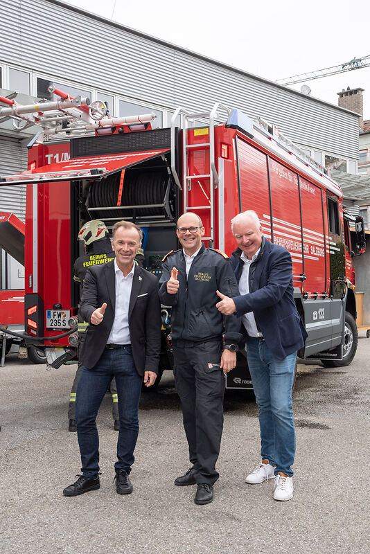 Bürgermeister Bernhard Auinger, Branddirektor Werner Kloiber und Vizebürgermeister Florian Kreibich beim Tag der offenen Tür der Berufsfeuerwehr Salzburg