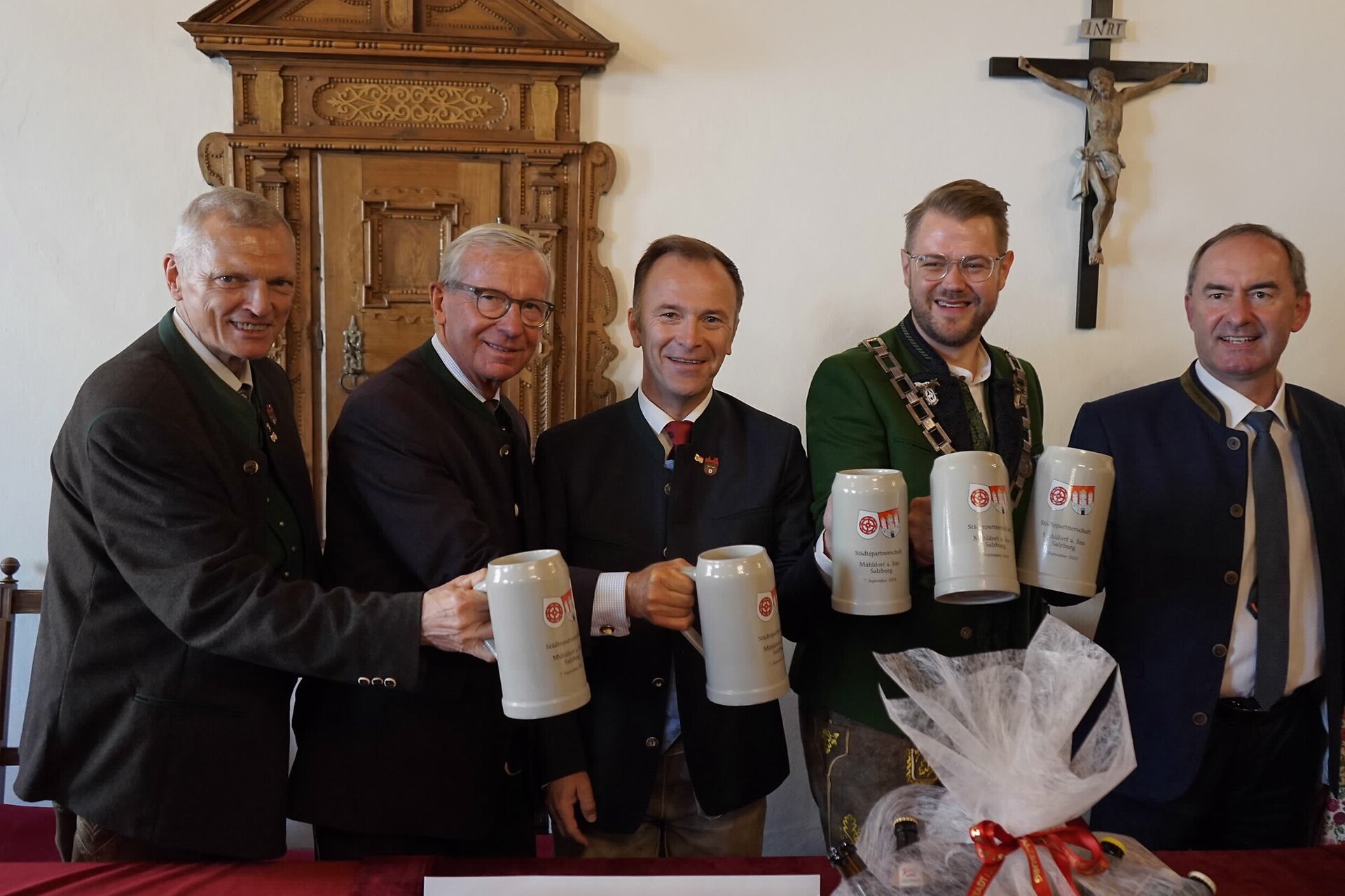 Gruppenbild mit eigens gestalteten Maßkrügen: Landtagsabgeordneter Josef Schöchl, Alt-Landeshauptmann Wilfried Haslauer, Salzburgs Bürgermeister Bernhard Auinger, Mühldorfs Bürgermeister Michael Hetzl und der stellvertretende bayrische Ministerpräsident Hubert Aiwanger (v. l.).
