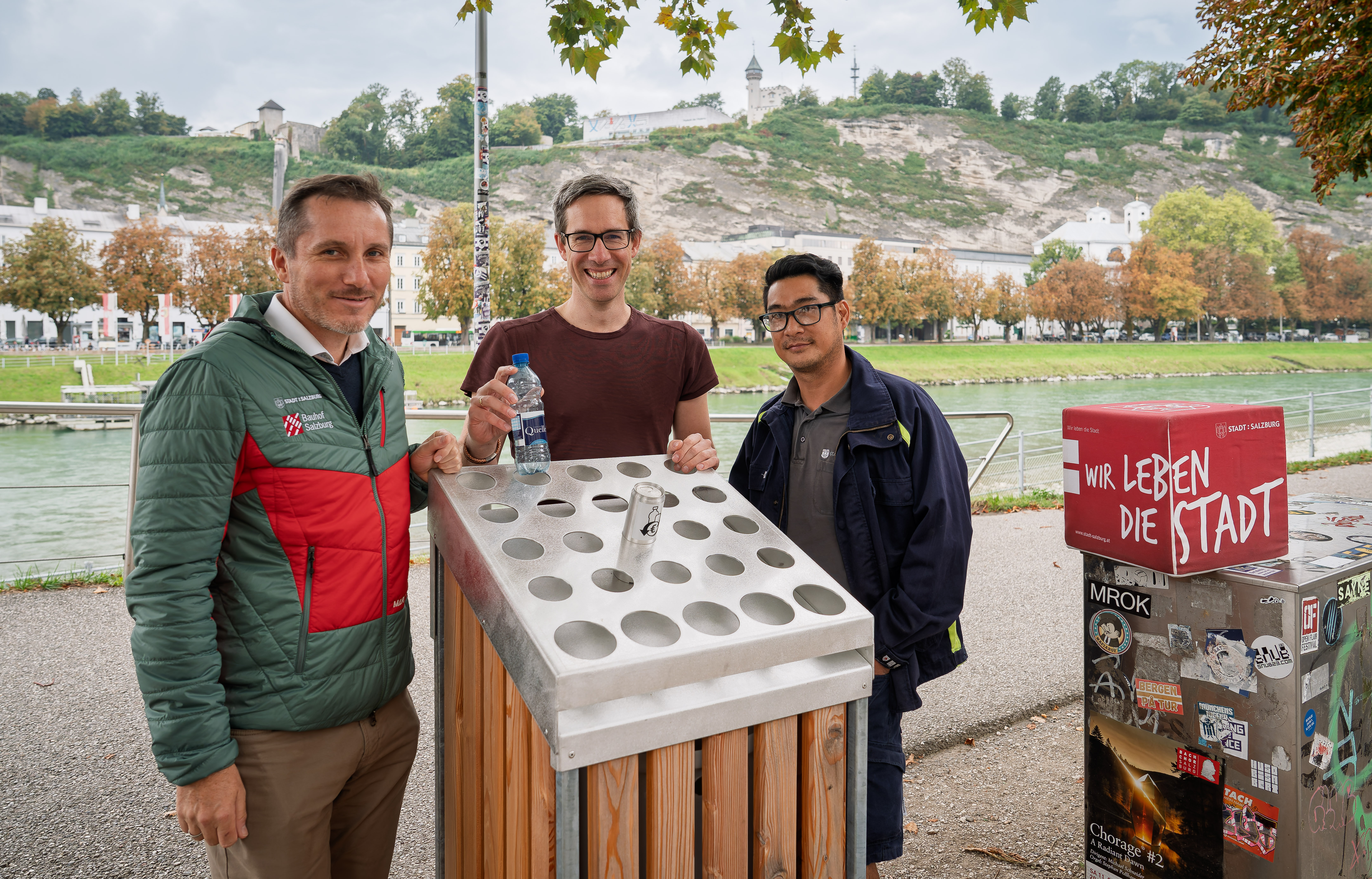 Die Stadt Salzburg testet ab sofort drei kreative Modelle zur Sammlung von Pfandflaschen und -dosen. An zehn Stationen entlang der Salzach wurden Pfandwürfel, Pfandhauben und Pfandnetze aufgestellt. Damit werden Pfandbehälter an stark besuchten Orten sichtbarer und nutzerfreundlicher gestaltet. Sie sind ein kleiner Anreiz, Pfanddosen und -flaschen zu recyclen, anstatt sie in den Restmüll zu werfen. Sie helfen auch, dass Mülleimer weniger stark durchwühlt werden, wenn Menschen nach Pfanddosen und -flaschen suchen.