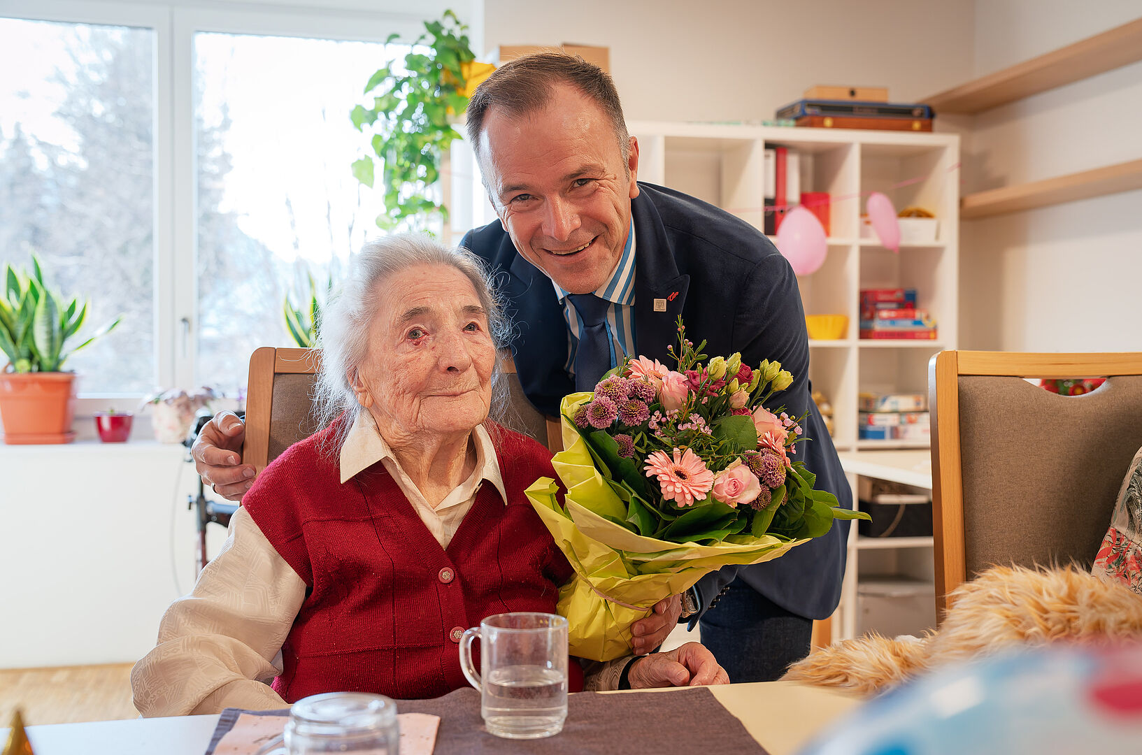 Beim Besuch von Bürgermeister Bernhard Auinger zeigte sich Frau Turri sehr wach und interessiert. Sie unterhielt sich mit dem Stadtoberhaupt über ihren Alltag und teilte mit ihm die eine und andere Erinnerung. Für eine würdige Geburtstagsatmosphäre sorgte auch das Team im Seniorenwohnhaus: Die Mitarbeiter:innen hatten für die Jubilarin einen hübsch dekorierten Tisch vorbereitet und eine kleine Feier organisiert, damit der besondere Tag im Haus Gaisberg in festlichem Rahmen begangen werden konnte.