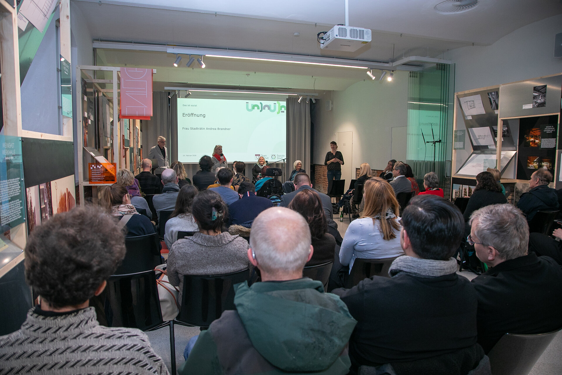 Am Podium diskutierten Michael Tasch (Landeskonservatorat für Salzburg), Baumeister Martin Sieger (Experte für barrierefreies Bauen), Christina Tscherteu (Expertin für barrierefreies Bauen) sowie Monika Schmerold (Expertin in eigener Sache und Obfrau des Vereins knackpunkt – Selbstbestimmt Leben Salzburg). Die Moderation übernahm Peter Spitaler.