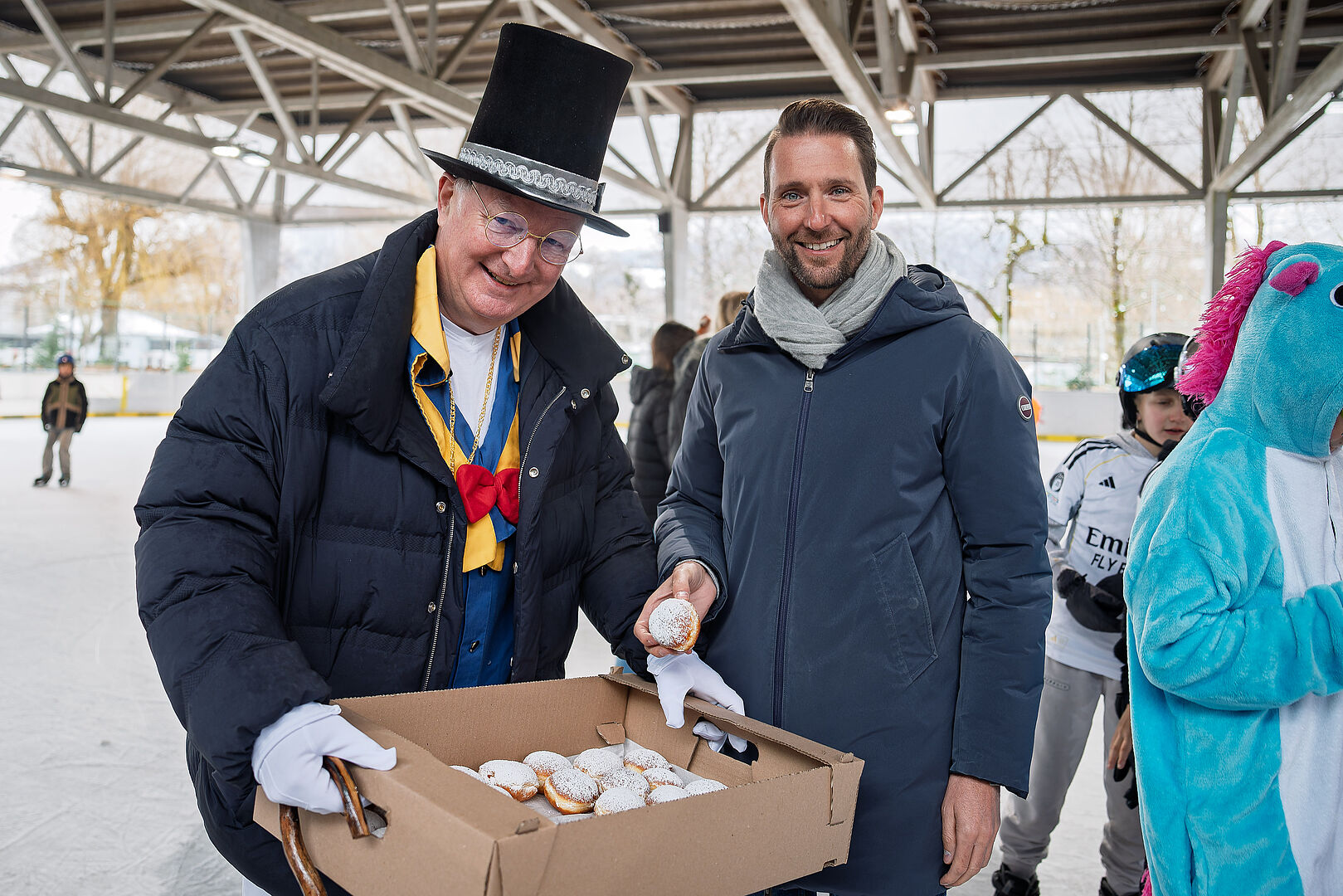 Freuen sich über die vielen Faschingsfans in der Eisarena (v.li.): Bgm.-Stv. Florian Kreibich und Roland Oberhauser (Leitung Städtische Betriebe)