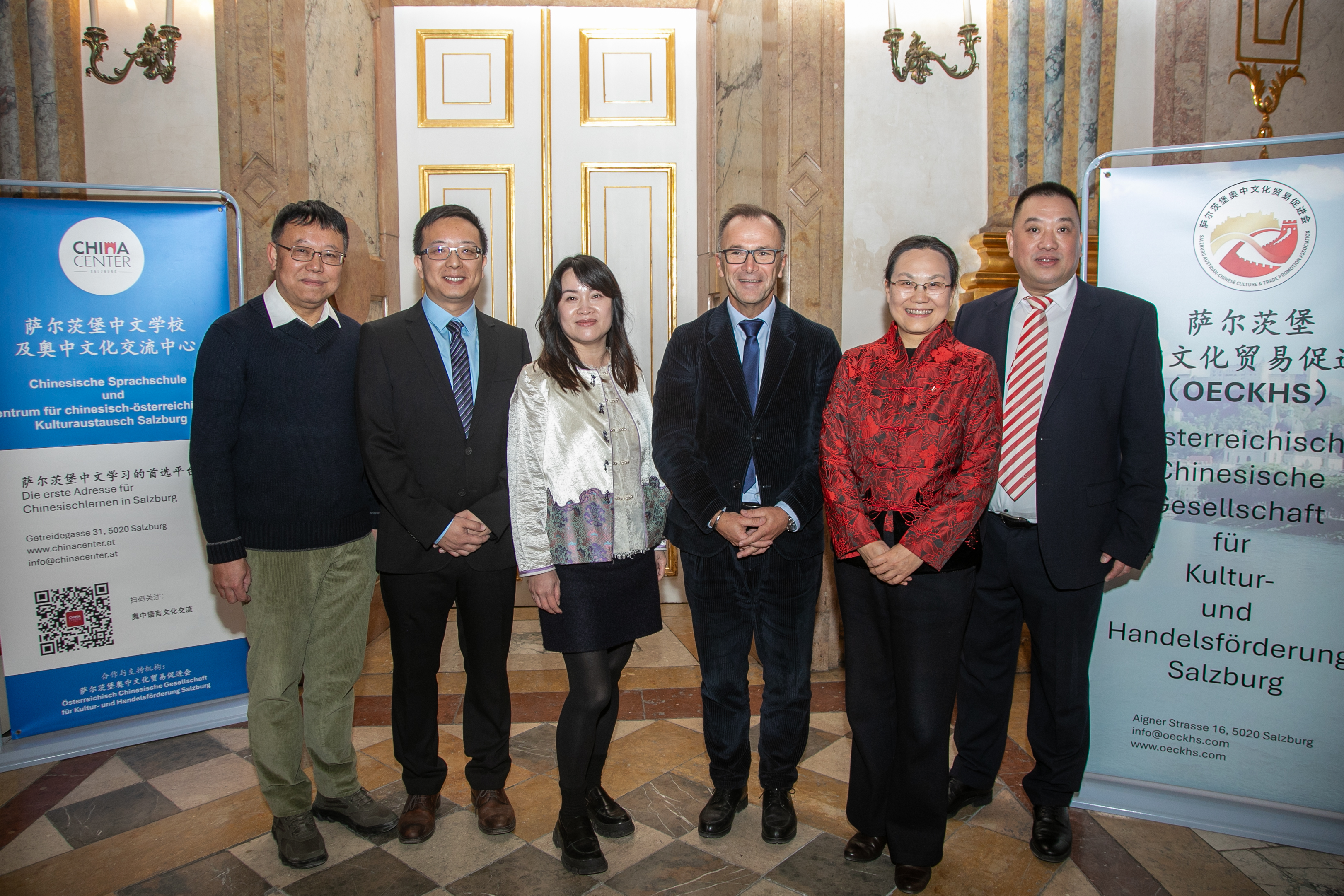 v..li.: Wu Weili, Qian Tao (Direktor der chinesischen Sprachschule), Zhang Liqun (Vize-Vorsitzende der Österreichisch-Chinesischen Gesellschaft für Kultur- und Handelsförderung Salzburg), Bürgermeister Bernhard Auinger, Botschafterin Qi Mei, Lin Yongmin (Vorsitzender der Österreichisch-Chinesischen Gesellschaft für Kultur- und Handelsförderung Salzburg)