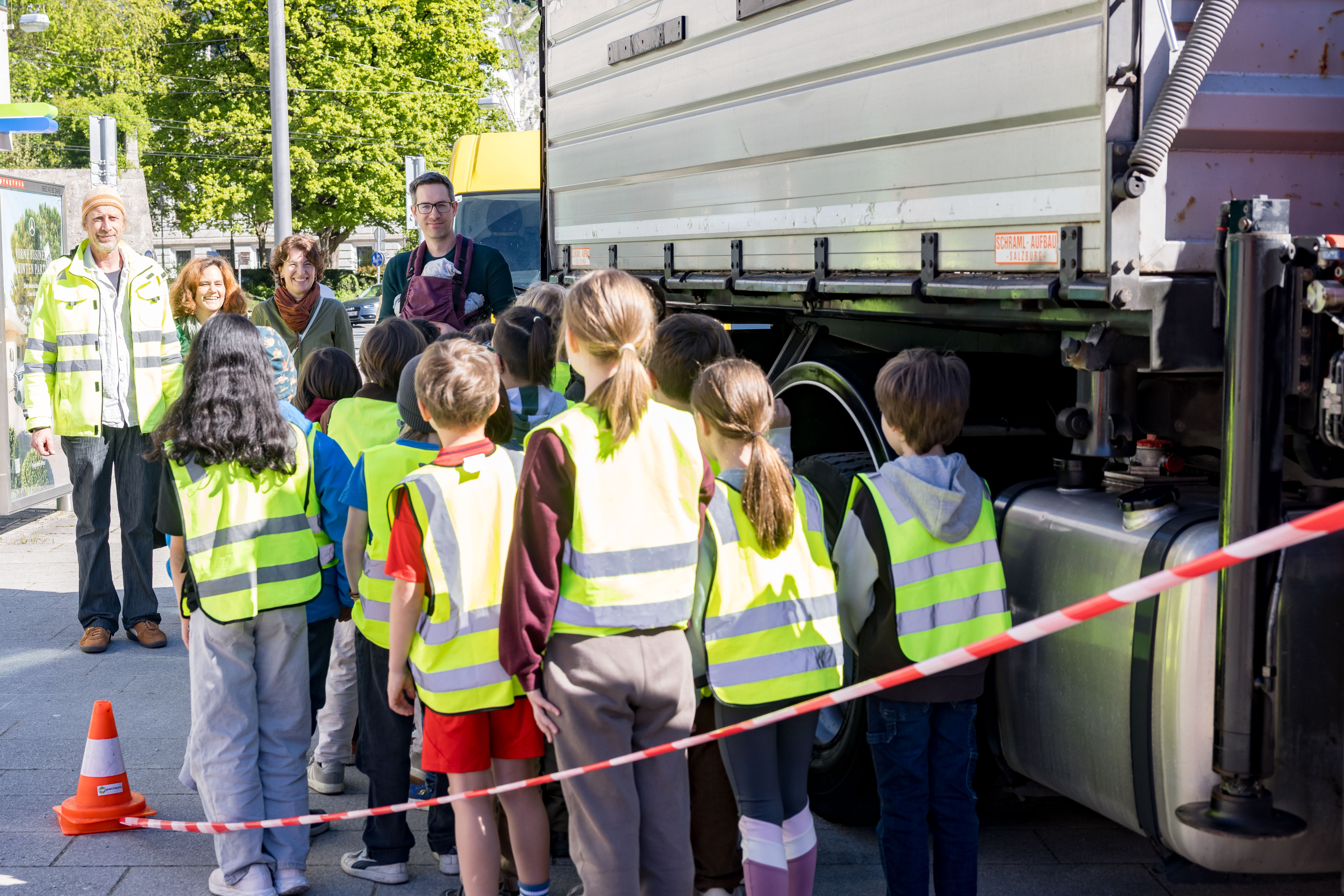Mit einem tonnenschweren Lkw hilft der städtische Bauhof, Volksschüler:innen anschaulich über Sicherheit im Straßenverkehr zu informieren
