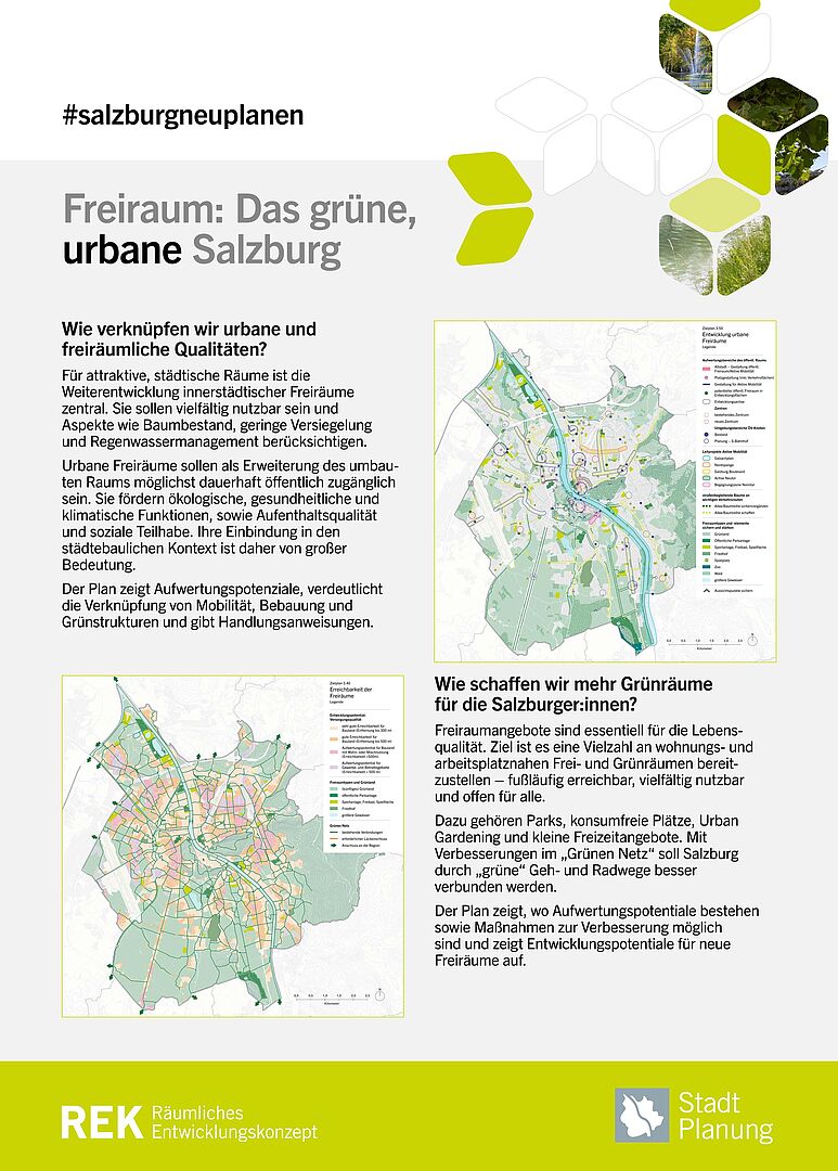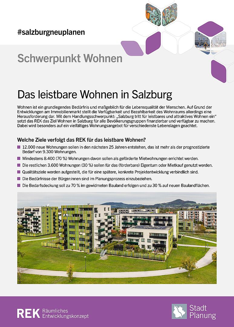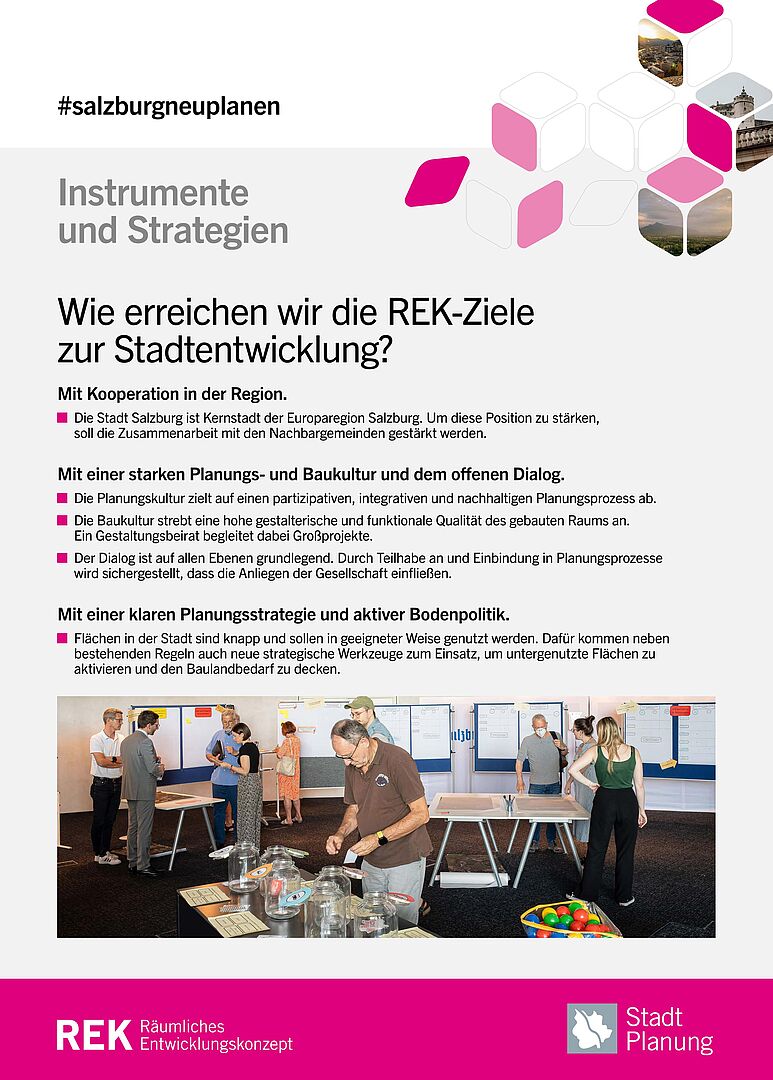 Es ist die Grundlage für alle weiteren Planungen wie Flächenwidmung, Bebauungspläne oder große Stadtentwicklungsprojekte. Damit sorgt das REK für Transparenz, langfristige Planungssicherheit und Lebensqualität für alle Salzburger:innen.