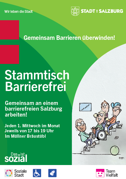 Komm’ zum Stammtisch Barrierefrei! Das ist ein offenes Treffen, bei dem alle Menschen willkommen sind! Hier hast du die Möglichkeit, deine Erfahrungen, Wahrnehmungen und Lösungen in Salzburg zu teilen.