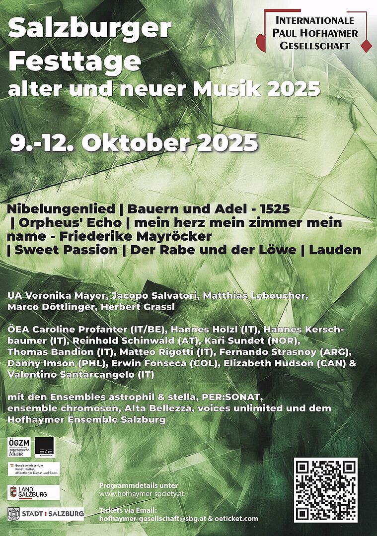 Die Internationale Paul Hofhaymer Gesellschaft lädt dieses Jahr bereits zur 5. Ausgabe der "Festtage Alter und Neuer Musik ein, die vom 9. bis 12. Oktober 2025 in Salzburg stattfindet. Es werden vier Tage voller neuer Höreindrücke mit zeitgenössischer und alter Musik.