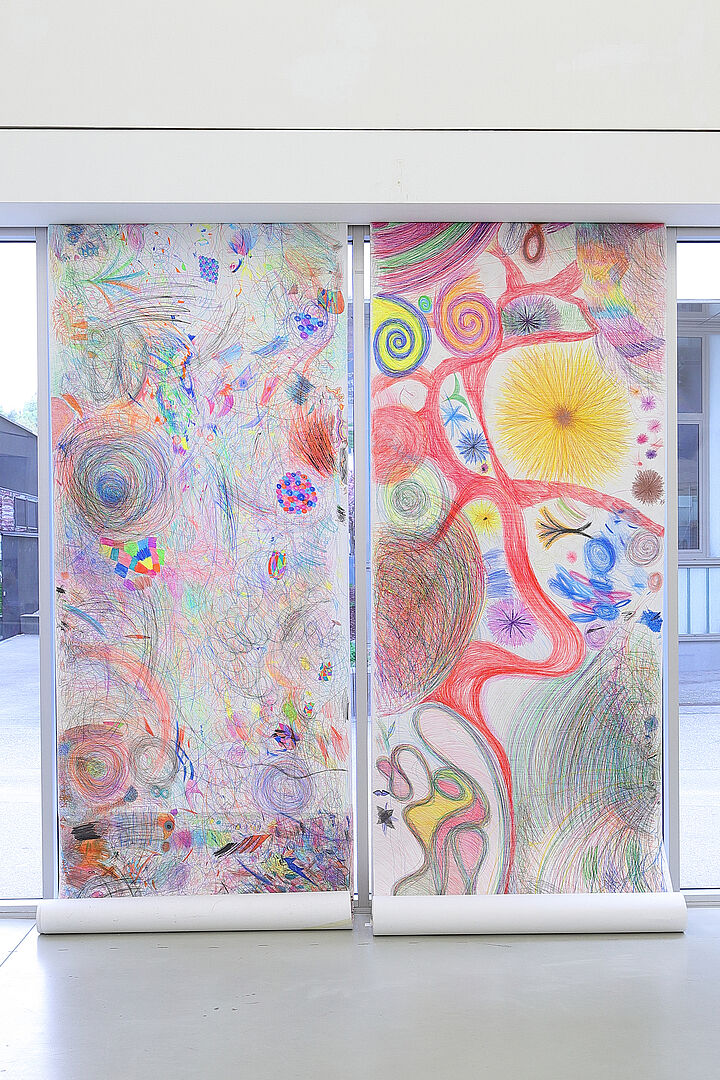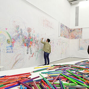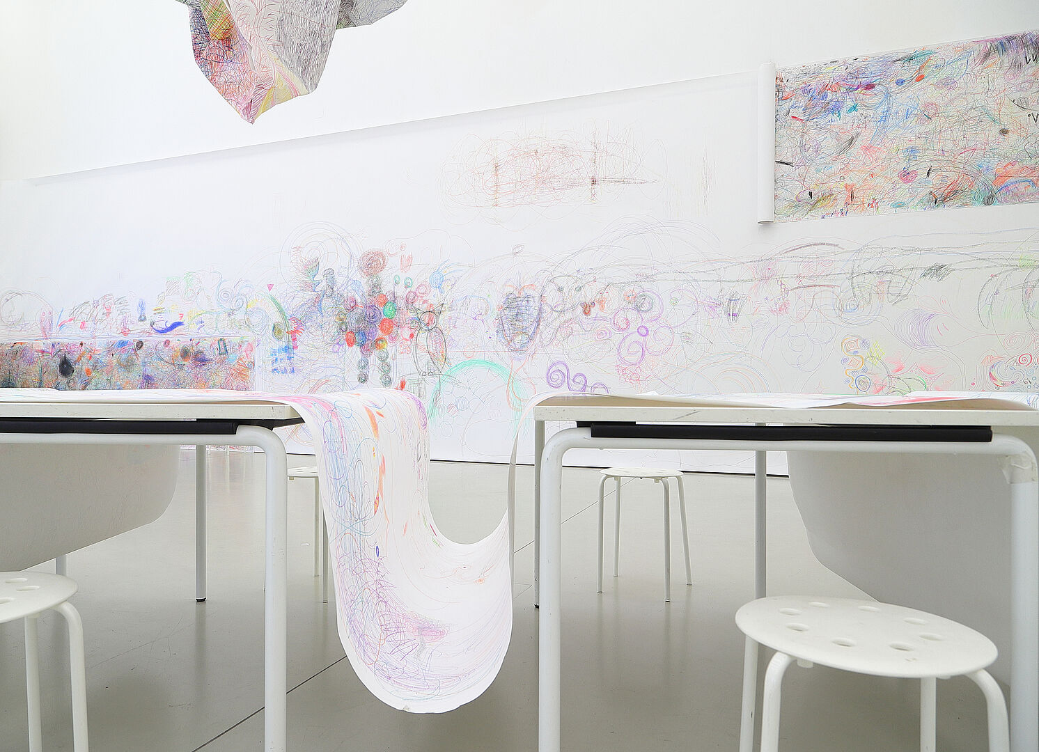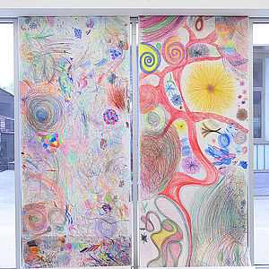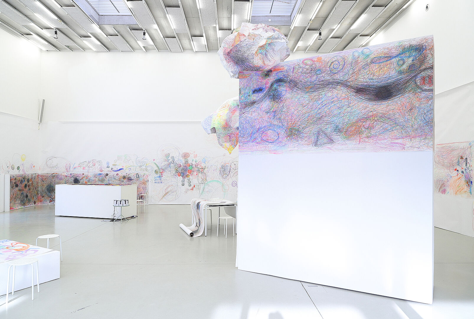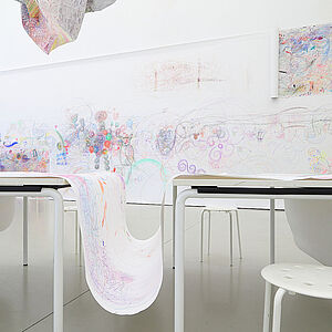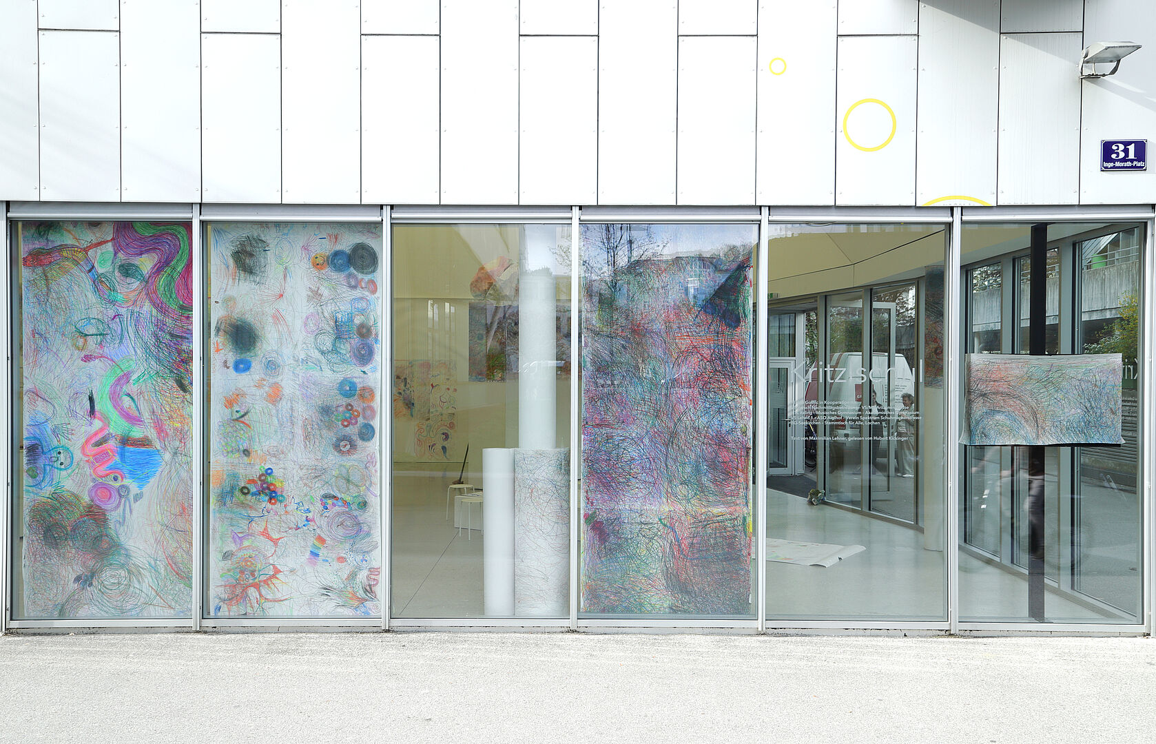 Kritzlschul ist eine partizipative Ausstellung, die die Stadtgalerie Lehen in einen offenen Handlungs- und Erfahrungsraum verwandelt. Sie hebt die klassische Rolle des Publikums als reine Betrachtende auf. Besucher:innen sind eingeladen, selbst aktiv zu werden und mit Buntstiften Spuren zu hinterlassen. Papierbahnen werden zu einer raumgreifenden Installation arrangiert, die sich während der Ausstellungsdauer kontinuierlich verändert.
