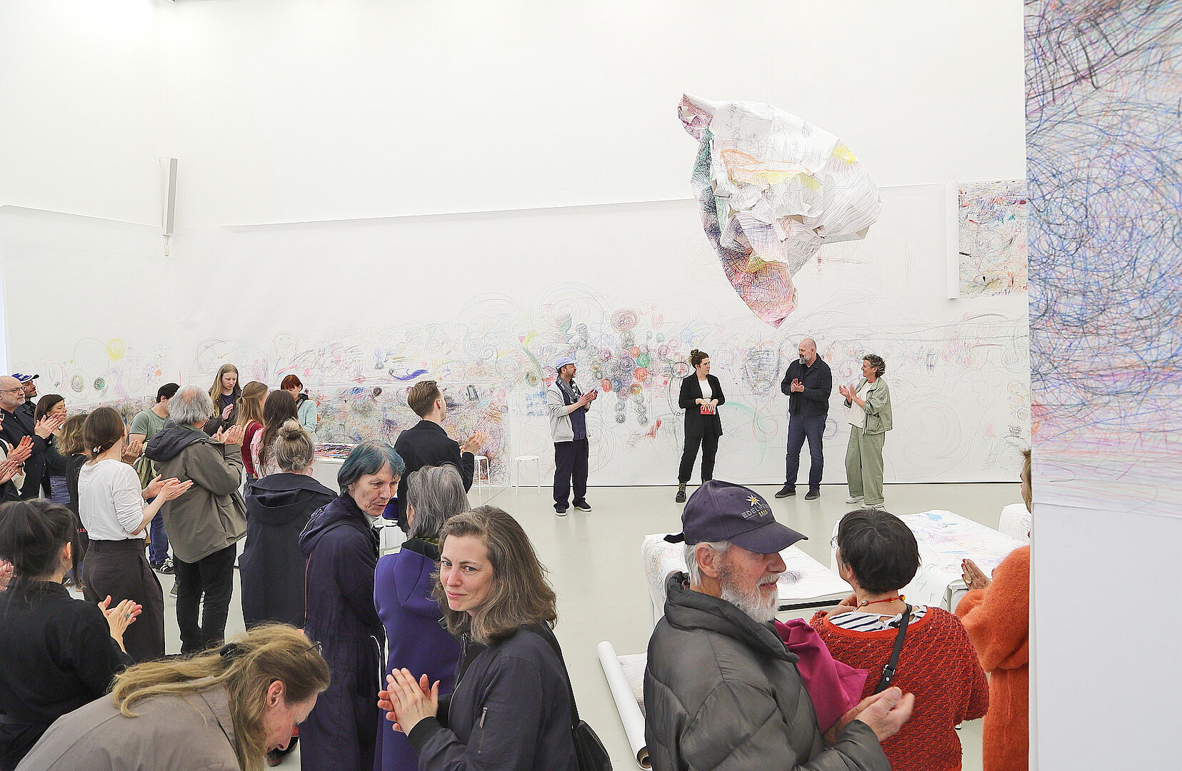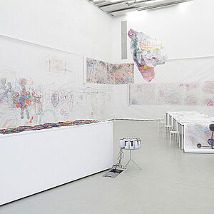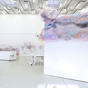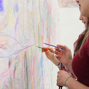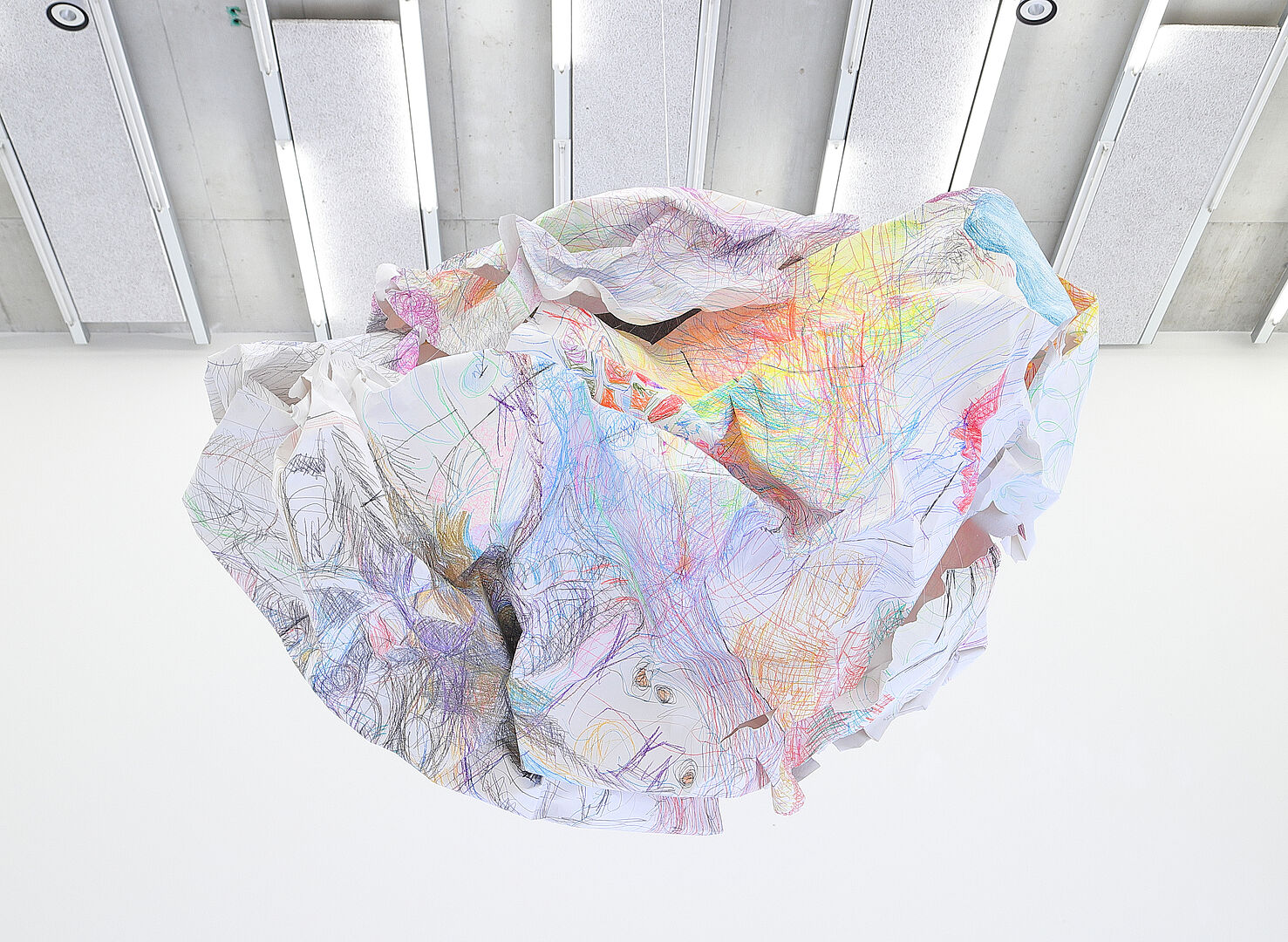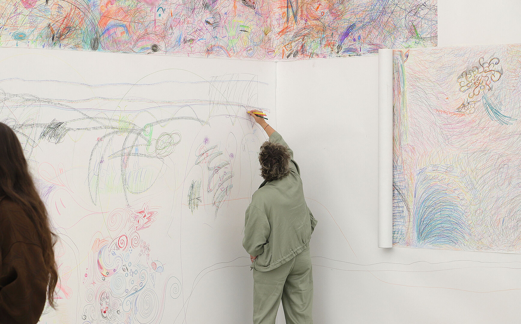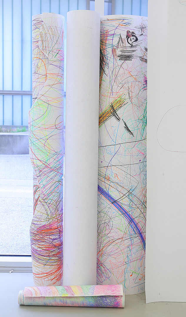 Kritzlschul ist eine partizipative Ausstellung, die die Stadtgalerie Lehen in einen offenen Handlungs- und Erfahrungsraum verwandelt. Sie hebt die klassische Rolle des Publikums als reine Betrachtende auf. Besucher:innen sind eingeladen, selbst aktiv zu werden und mit Buntstiften Spuren zu hinterlassen. Papierbahnen werden zu einer raumgreifenden Installation arrangiert, die sich während der Ausstellungsdauer kontinuierlich verändert.