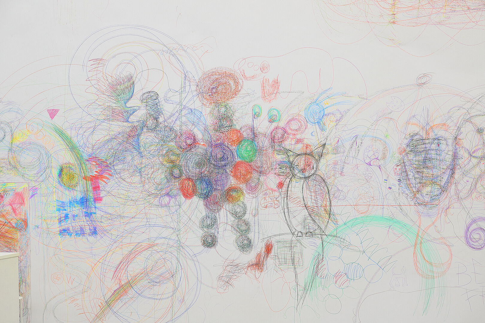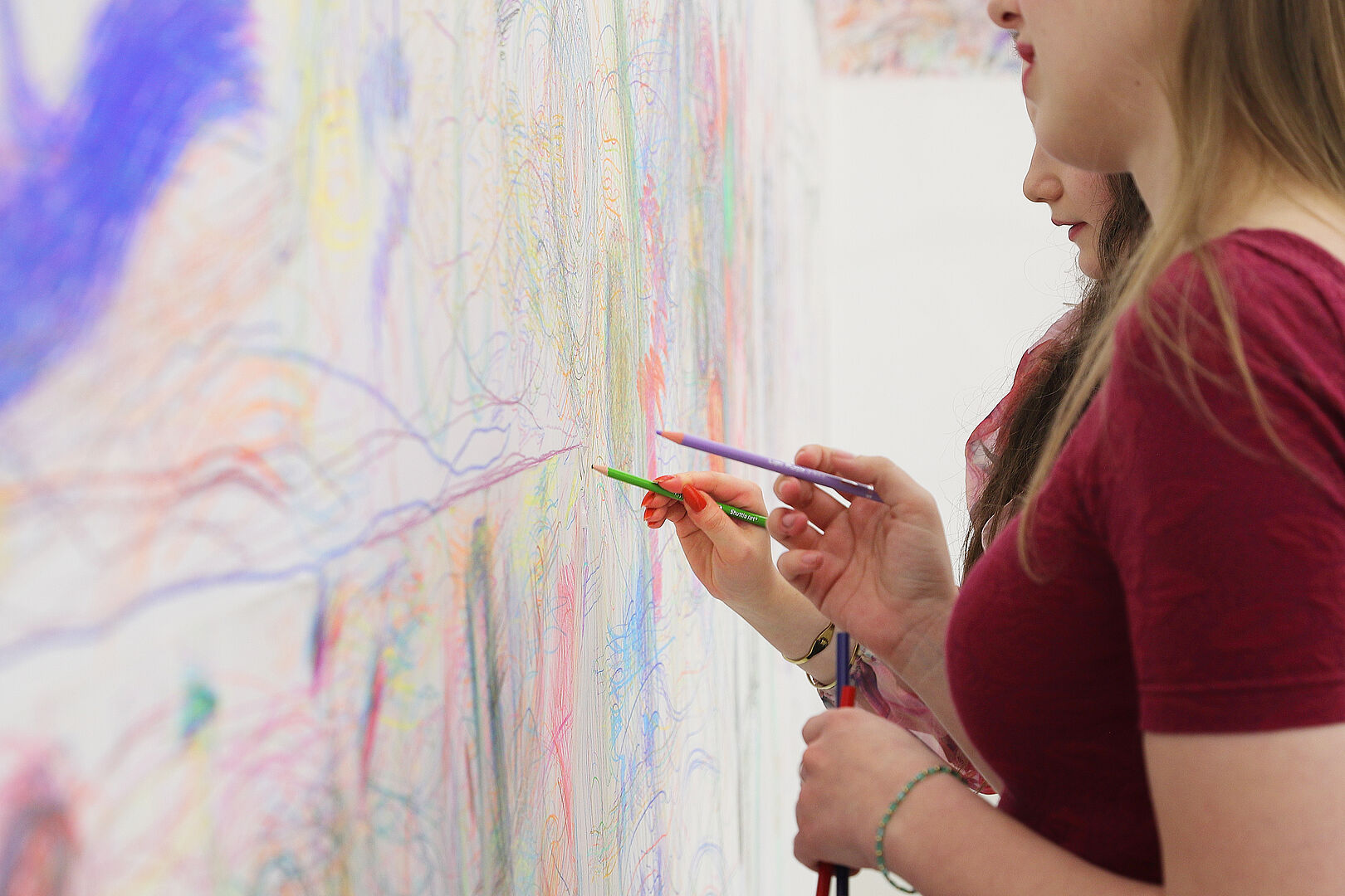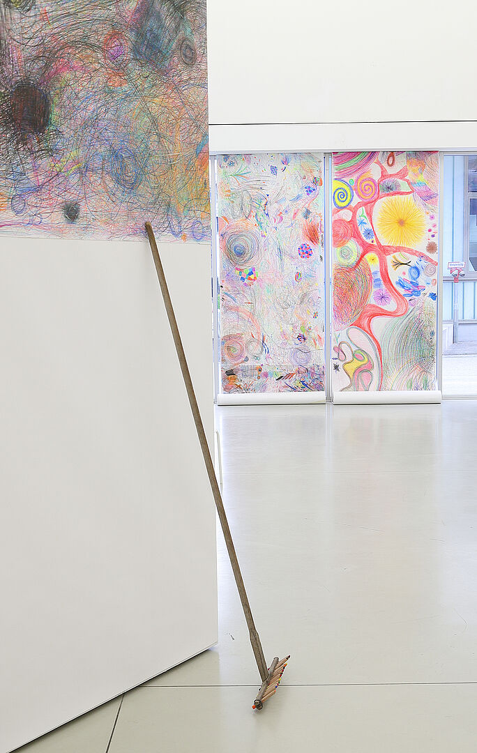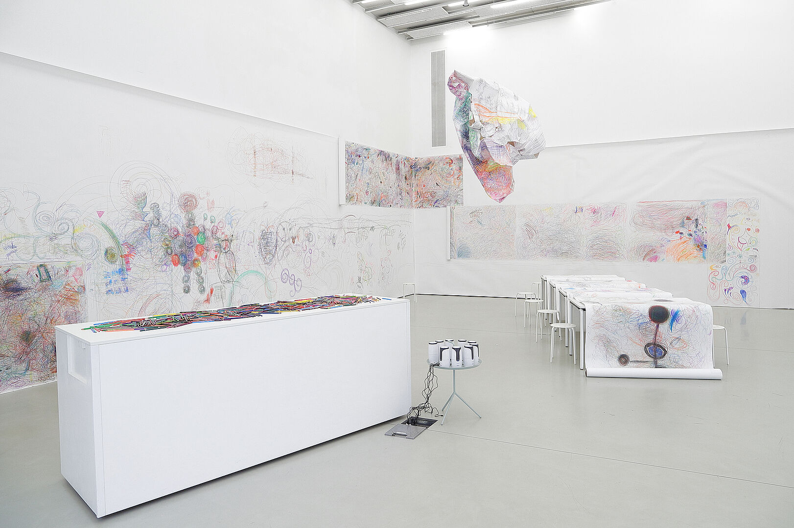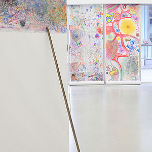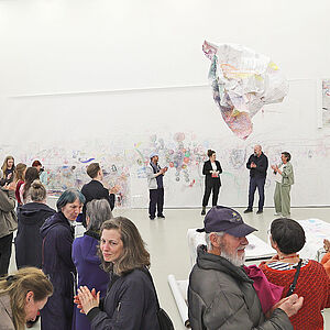 Kritzlschul ist eine partizipative Ausstellung, die die Stadtgalerie Lehen in einen offenen Handlungs- und Erfahrungsraum verwandelt. Sie hebt die klassische Rolle des Publikums als reine Betrachtende auf. Besucher:innen sind eingeladen, selbst aktiv zu werden und mit Buntstiften Spuren zu hinterlassen. Papierbahnen werden zu einer raumgreifenden Installation arrangiert, die sich während der Ausstellungsdauer kontinuierlich verändert.