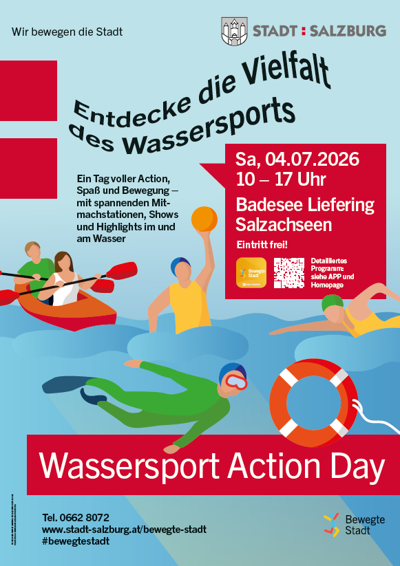 Beim WASSERSPORT ACTION DAY präsentieren Vereine und Verbände aus Salzburg ihre faszinierenden Sportarten im und am Wasser. An zahlreichen Mitmachstationen kannst du jede Sportart aktiv ausprobieren − von Kajak über Tauchen, Rudern, Schwimmen, Wasserball uvm.: hier kannst du die ganze Vielfalt des Wassersports entdecken!