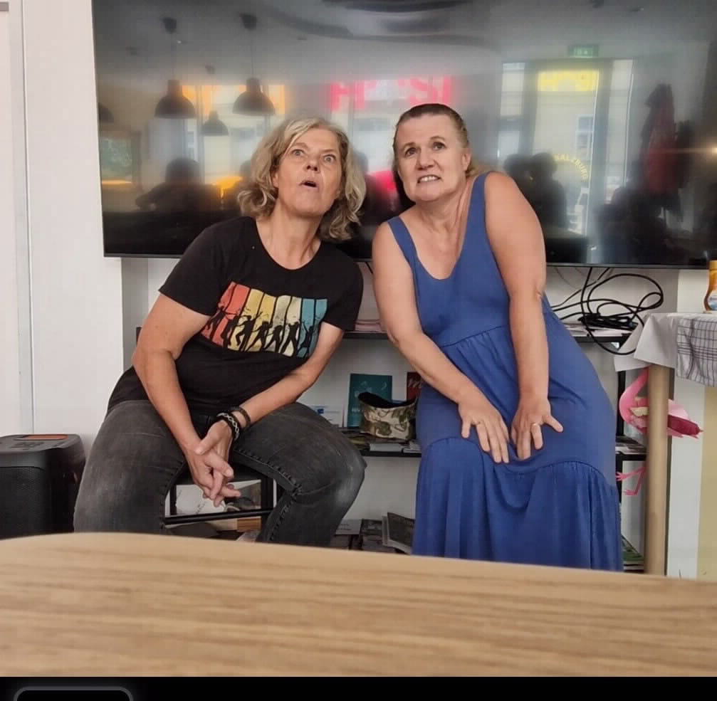 Prof. Lan Weiser und die Künstlerin Lea Karacha, gespielt von Kate Schock und Anja Uhliv, treffen sich im Foyer eines Radiosenders und warten auf ihre Interviews zum Thema Gleichberechtigung.