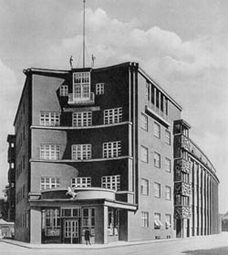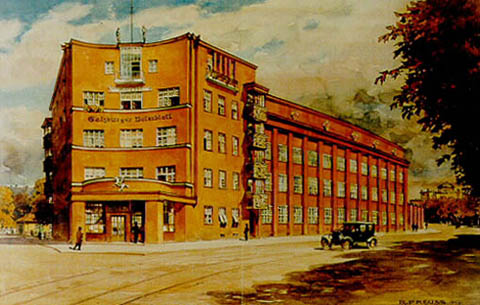 | Das Gebäude der Buch- und Kunstdruckerei R. Kiesel verlieh seiner Umgebung einen starken architektonischen Akzent. Es gilt heute als der Schlüsselbau der Salzburger Moderne. | |||