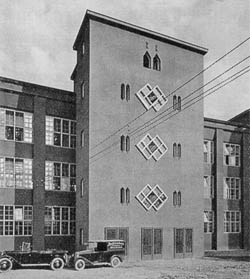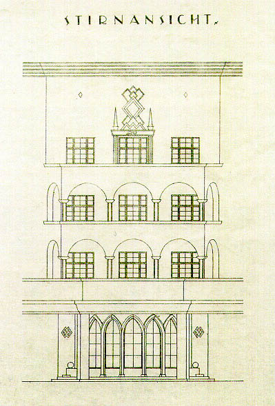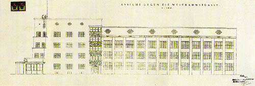 | Erster Entwurf Deiningers, Ansicht Büro- und Verwaltungsgebäude 1923 (AStS). | |||