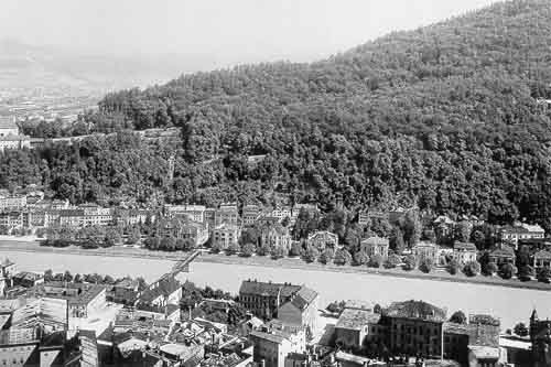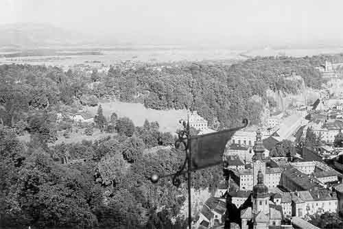 Panorama durch Rainberg und Mönchsberg teilweise verdeckt - war die von der Riedenburg ausgreifende städtische