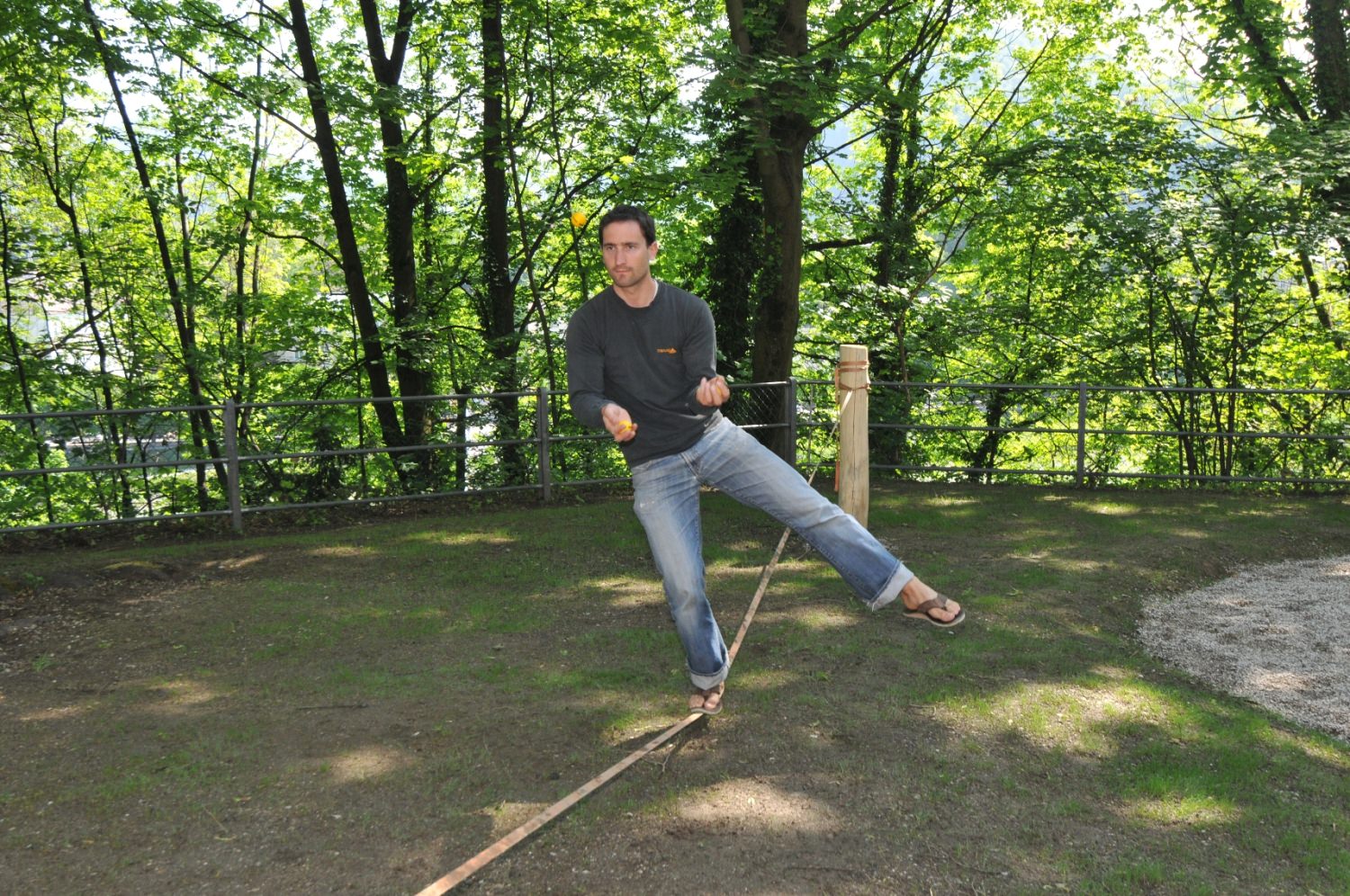 Slacklines: Drei Balancierbänder – so genannte Slacklines - mit unterschiedlichen Längen in einer Höhe von ca. 90 cm vom Boden angebracht, dienen dem vorbereitenden Gleichgewichtstraining. Gehalten werden sie von Robinien-Holzstehern.