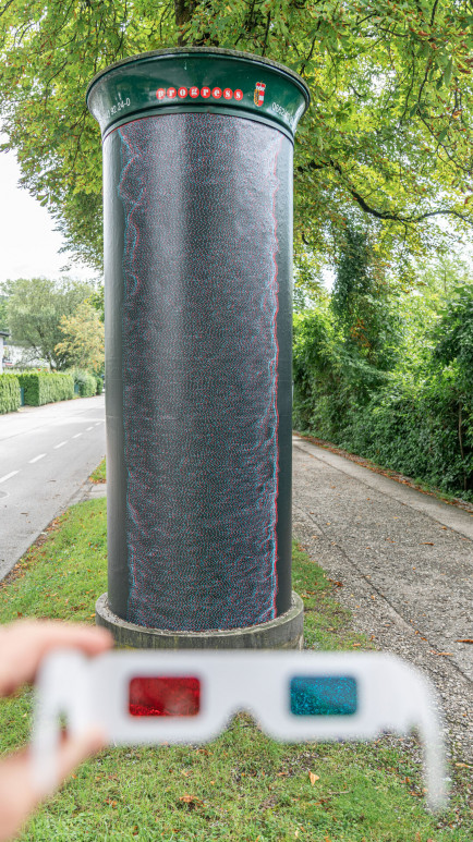 Die Bedeutung der Medien wird durch das symbolische Informationsinstrument der Litfaßsäule thematisiert. Durch diese künstlerische Intervention werden die Passanten dazu aufgefordert in der Informationsflut heutiger Zeiten zwischen den Zeilen zu lesen, ihren Blickpunkt und ihre Sichtweise, den persönlichen „Point of View“, zu hinterfragen und neu zu justieren.