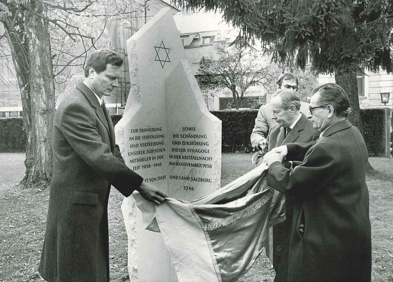 Zugleich kam es unter der Präsidentschaft Feingolds von offizieller Seite sukzessive zu mehr Anerkennung und Respektsbekundungen gegenüber der jüdischen Gemeinde: So wurde im November 1985 auf dem Vorplatz der Salzburger Synagoge ein Mahnmal errichtet, das an die zwischen 1938 und 1945 verfolgten und vertriebenen Salzburger Juden und Jüdinnen erinnern soll. Erstmals wurde hierbei von Seiten der Republik Österreich eine Mitschuld an der Verfolgung der jüdischen Bevölkerung einbekannt. Aus Sicherheitsgründen befindet sich das Erinnerungsdenkmal aber im Inneren des Synagogengeländes, hinter einer Hecke und einem Gitter und ist von der Straße kaum einsehbar. Dass der Platz traurigerweise gut gewählt war, bezeugt auch folgender Umstand: Kurz nach der Aufstellung wurde die Hausmauer des Steinbildhauers, der das Denkmal angefertigt hatte, mit einem Davidstern besprüht.
