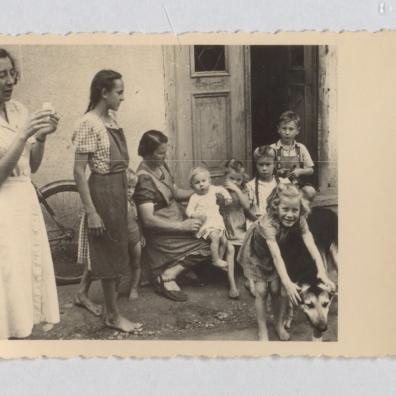 Maria Hildegard Holzschmid im Alter von 14 Jahren mit Kusine und einem Hund bei ihrem ersten Aufenthalt in Südtirol, in Bozen