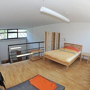 Das Stadt:Atelier liegt auf zwei Ebenen und besteht aus einem voll eingerichteten 70 m² großen Arbeits- und Wohnraum.