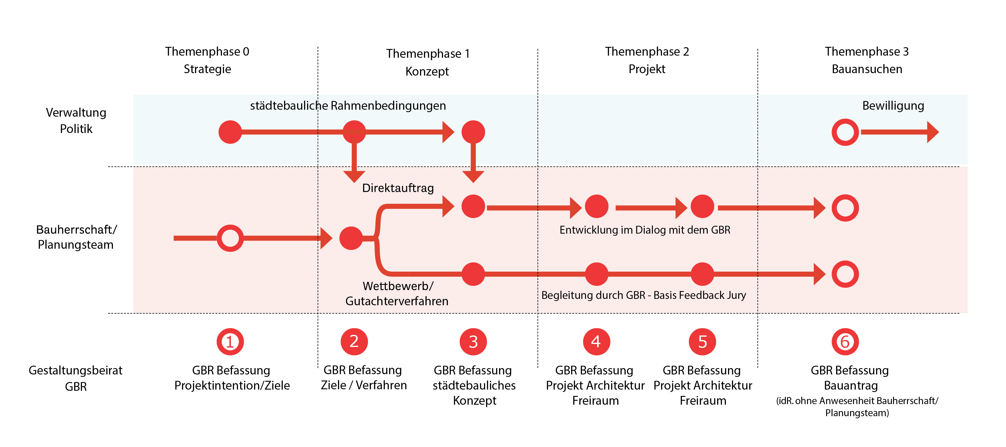 Der erste Kontaktpunkt zwischen Baubewerber*Innen und der Stadt (Verwaltung & Politik) sowie dem Gestaltungsbeirat findet in der sogenannten Themenphase 0 statt. Hier wird die grundsätzliche Projektintention vorgestellt und diskutiert. Resultat dieser Phase ist eine Einschätzung zur grundsätzlichen Machbarkeit sowie eine fachliche Haltung zum Vorhaben und zu möglichen Planungszielen. Die Themenphase dient als Grundlagenphase für die darauf folgende Entwicklung des städtebaulichen Konzepts. Durch den frühen Kontakt in der strategischen Phase kann ebenfalls früh die verwaltungsinterne Bearbeitung der städtebaulichen Rahmenbedingungen initiiert werden.