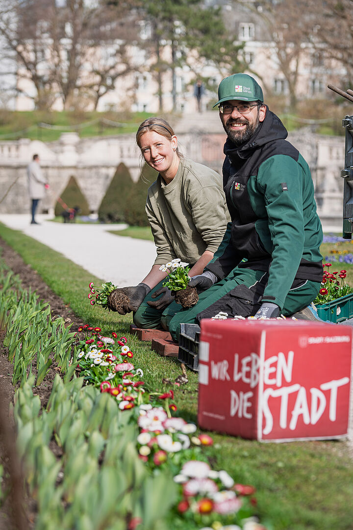 Ein Schwerpunkt der Frühjahrsauspflanzung liegt im Mirabellgarten: Dort werden die meisten Pflanzen aus der Stadtgärtnerei gesetzt. Allein rund 10.000 Frühlingsblumen, vor allem Stiefmütterchen und Goldlack, werden für die barocke Frühlingsblüte in der denkmalgeschützten Schlossparkanlage benötigt. Gemeinsam mit den bereits im Herbst gesetzten mehr als 15.000 Zwiebelpflanzen entsteht dort ein eindrucksvolles Frühlingsblütenmeer.
