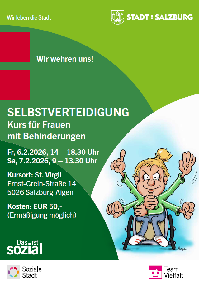 Am Freitag, 6. Februar 2026, startet in St. Virgil ein Selbstverteidigungskurs für Frauen mit Behinderungen. Für den zweitägigen Kurs nach der Methode „Drehungen“ sind noch wenige Plätze verfügbar. Bei Bedarf wird der Kurs in die Österreichische Gebärdensprache übersetzt, persönliche Assistent:innen sind herzlich willkommen.
