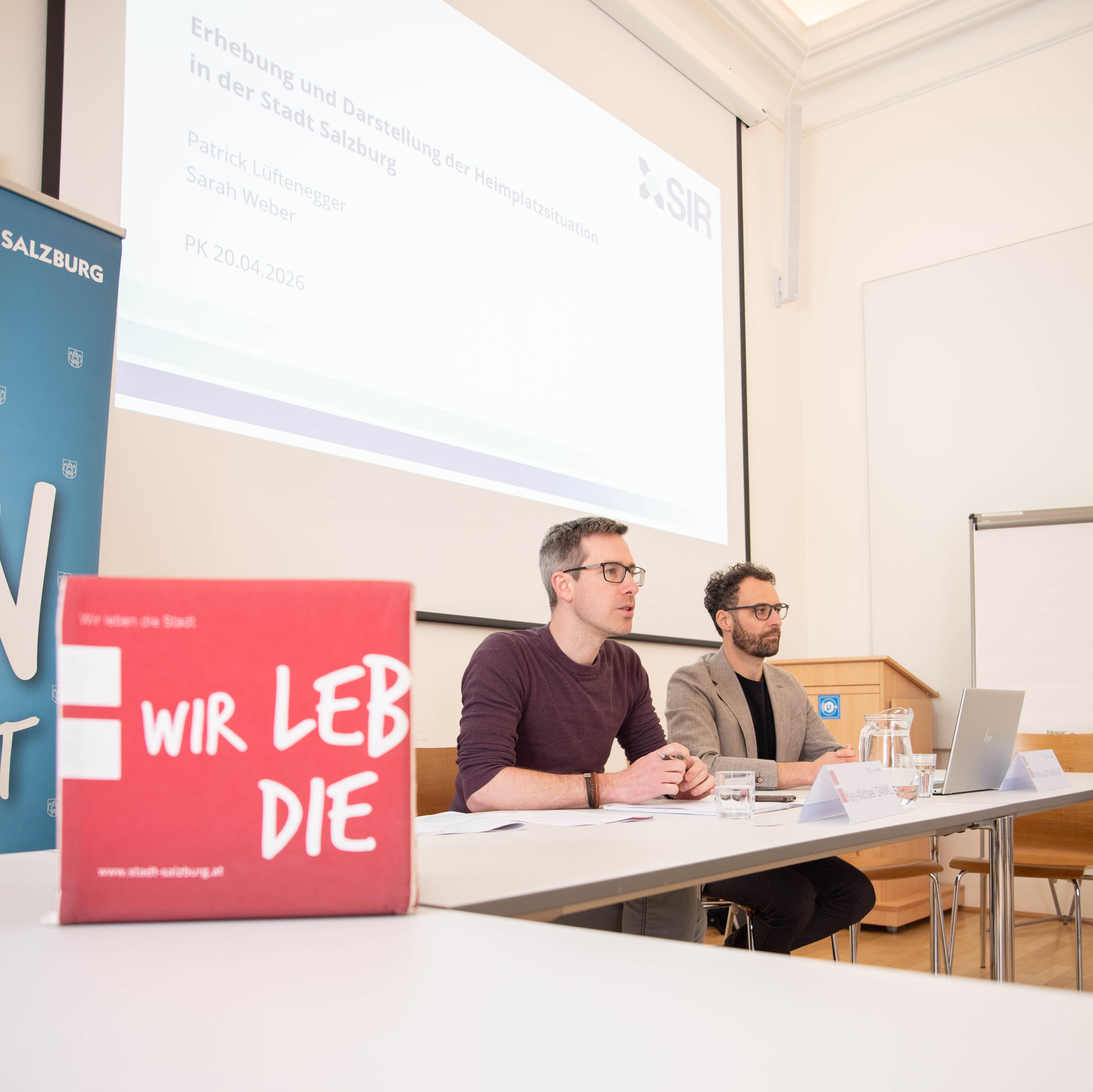 Bürgermeister-Stellvertreter Kay-Michael Dankl (li.) und Patrick Lüftenegger vom Salzburger Institut für Raumordnung und Wohnen (SIR) bei der Präsentation der Studie zur Heimplatzsituation junger Menschen in der Stadt Salzburg.
