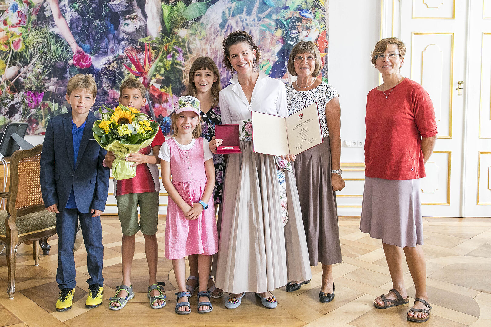 Als sie von der Ehrung mit dem Stadtsiegel erfahren habe, sei das „eine riesige Freude, aber auch eine Überraschung“ gewesen, sagte Nina Salchegger beim Empfang im Büro des Bürgermeisters im Schloss Mirabell. Für die Ehrung bedanke sie sich herzlich bei der Stadt Salzburg; ihr großer Dank gelte aber auch ihren Eltern und all den wunderbaren Menschen, denen sie am Markt begegnet sei. Mutter und Tante, Nichten und Neffen haben Nina Salchegger begleitet.
