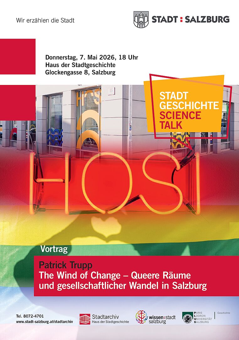 Anhand von Archivmaterialien, darunter von der HOSI an das Stadtarchiv übergebene Dokumente, zeichnet der Vortrag nach, mit welchen Herausforderungen die LGBTIQ- Community in Salzburg konfrontiert war und welche Rolle die HOSI Salzburg bis heute für Sichtbarkeit, Vernetzung und gesellschaftlichen Wandel spielt.