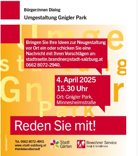 Die Stadt lädt diesen Freitag, 4. April zum Dialog für die geplante Umgestaltung des Gnigler Parks. Bewohner:innen und Leute aus dem Stadtteil können vor Ort ihre Ideen einbringen, oder diese direkt an stadtraetin.brandner@stadt-salzburg.at schicken.