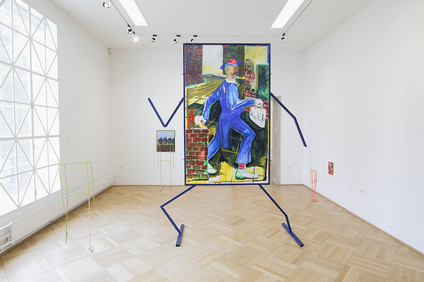 Urbane Umgebungen bilden den Bühnenraum für Peter Fritzenwallners Bilderzählungen. Vage angedeutete Stadträume, zwischen Arbeiterviertel, Ziegelhaufen und Ringstraßenbaustelle, verwischen die Ikonen des Stadtmarketings und rücken das Handlungsgefüge der Straßenszenen in den Vordergrund. Beobachten wir Aufstände oder Liebestreffs, flaniert da vorne ein feiner Herr in blauem Frack oder doch ein Freak, den sogleich ein Ruf zur Ordnung ereilt?