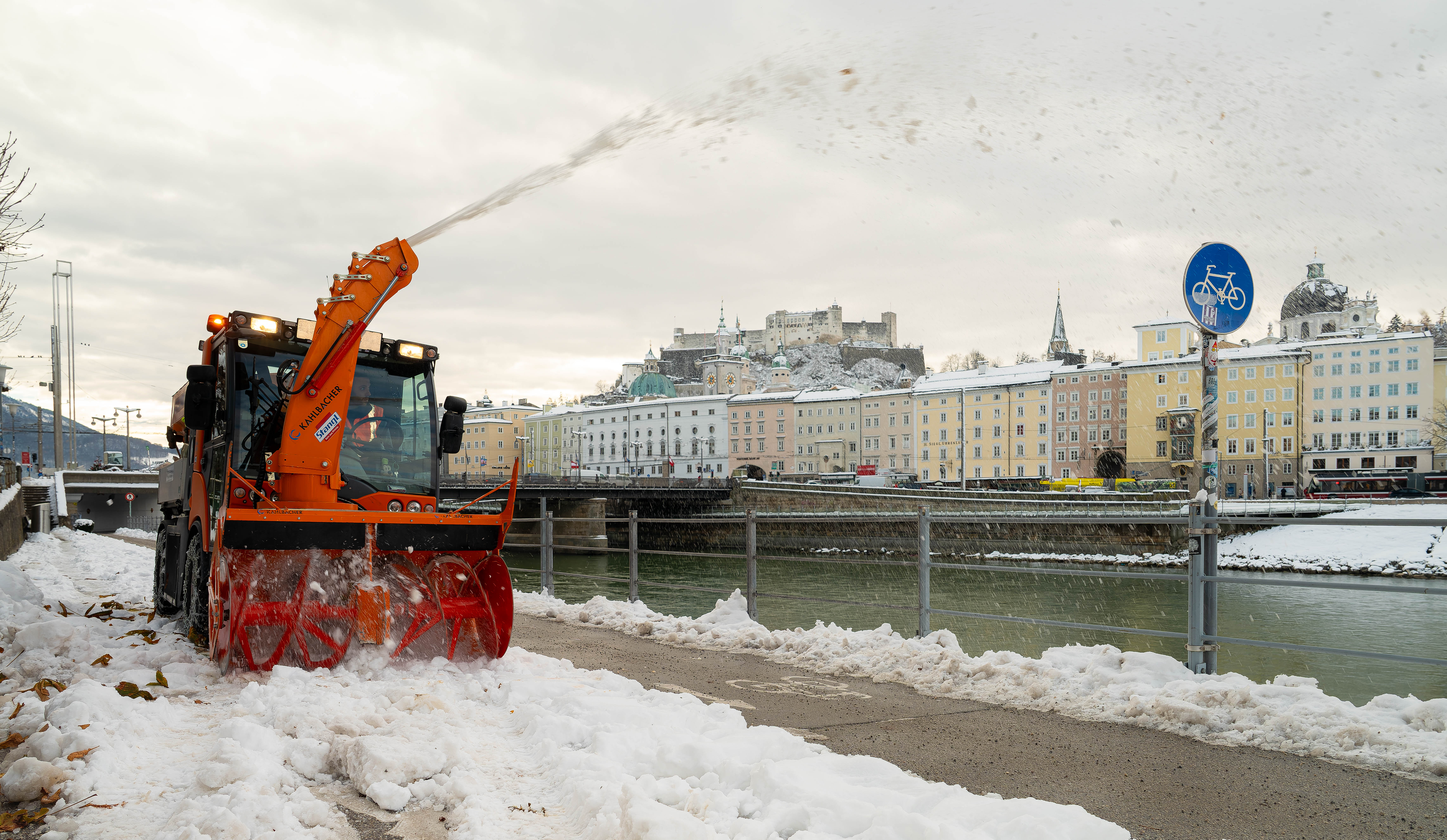 Der Winterdienst der Stadt Salzburg ist rund um die Uhr im Einsatz, um die Straßen und Gehsteige sicher zu halten. Bei winterlichen Bedingungen müssen knapp 650 Kilometer Straßen – davon 95 Kilometer Buslinien sowie 180 Kilometer Radwege – von Schnee und Eis befreit werden. Bereits ab 5 Uhr früh werden die Haltestellenbereiche geräumt und gestreut.